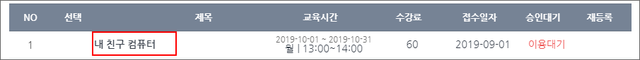 마이페이지 > 수강 메뉴에서 예약 및 신청한 강좌목록을 확인할 수 있습니다.