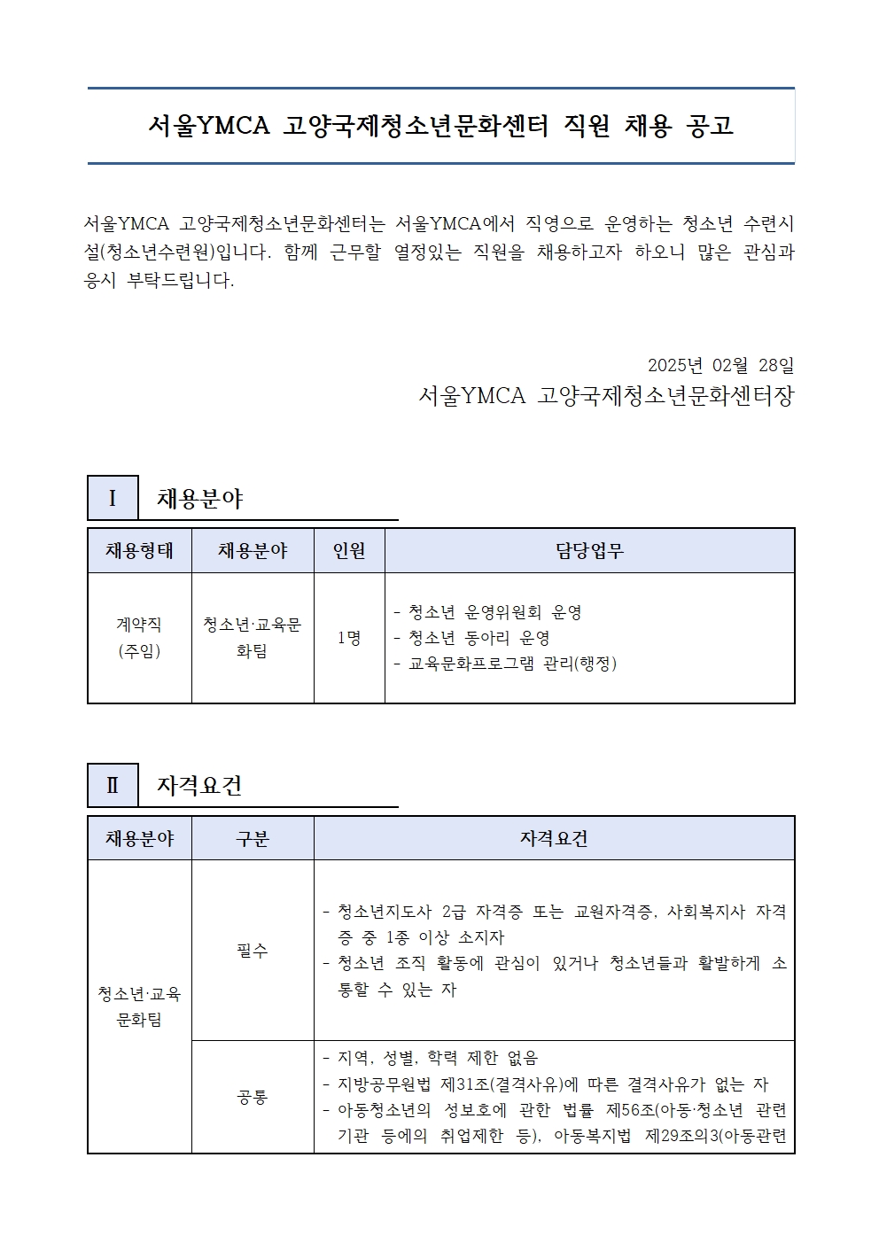 2025 서울YMCA 고양국제청소년문화센터 직원 채용 공고(서류 접수 ~3/21 까지) 등록일자2025-02-28 조회수1,562 첨부파일 (붙임1~3)입사지원서, 자기소개서, 개인정보활용동의서.hwp previous next List